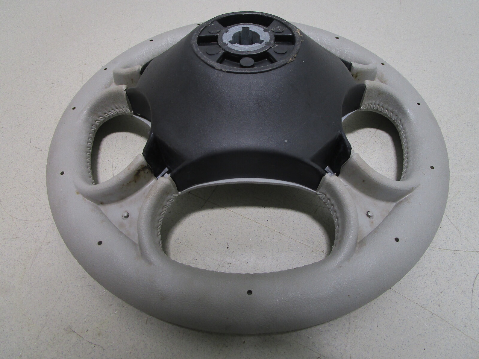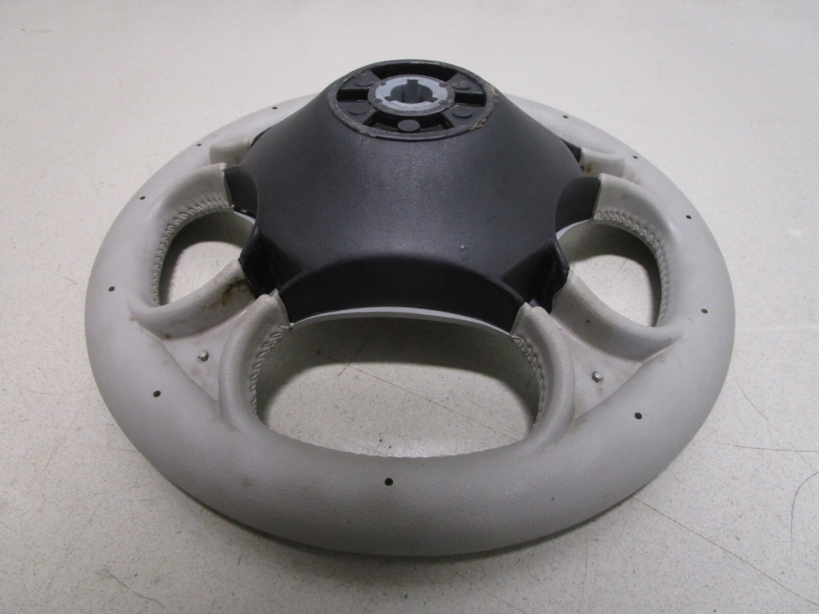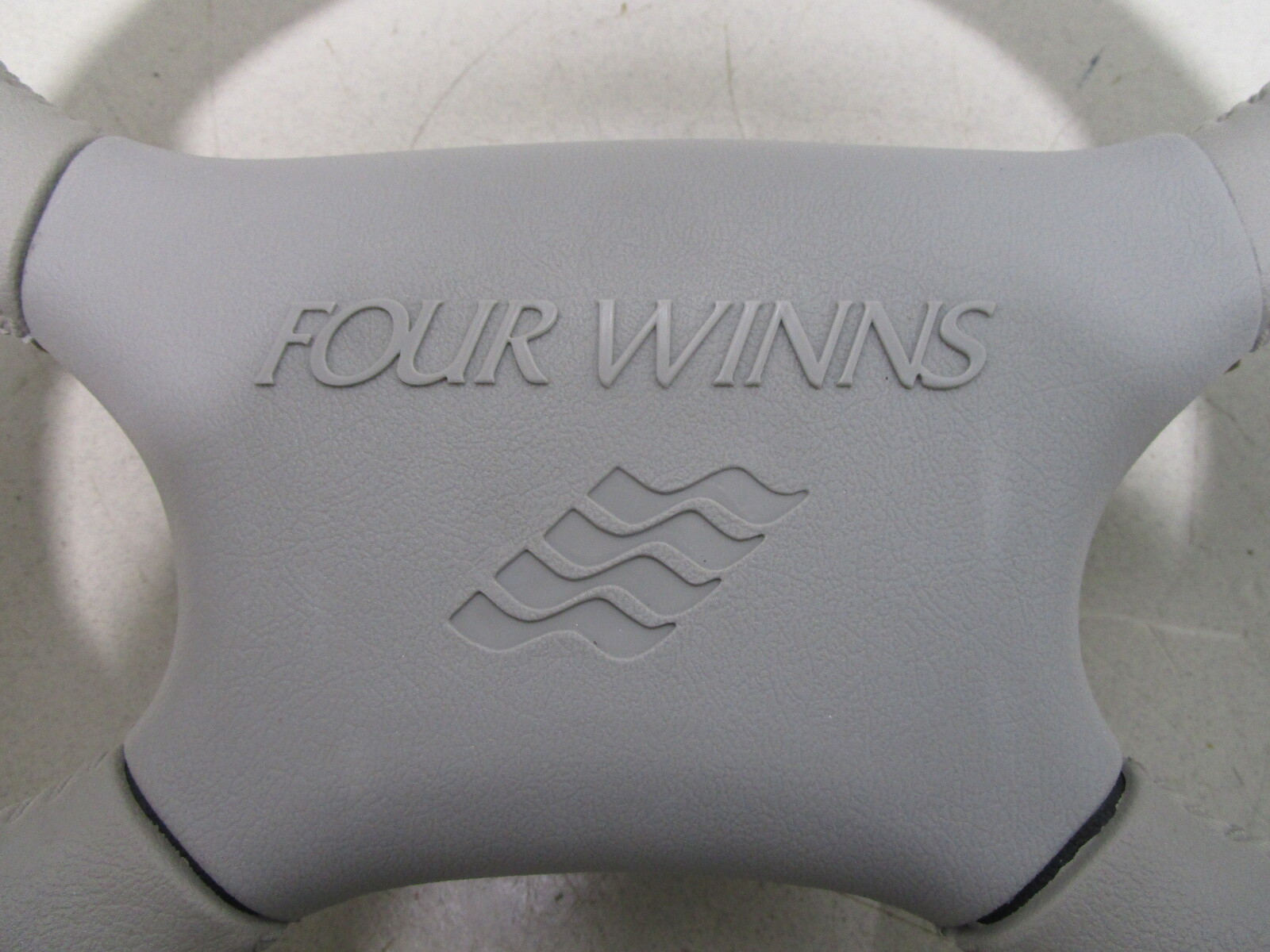 This boat steering wheel is a light grey . The Four Winns emblem is in the center of the hub.