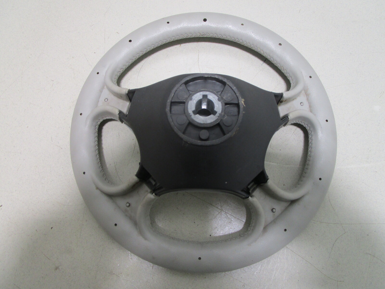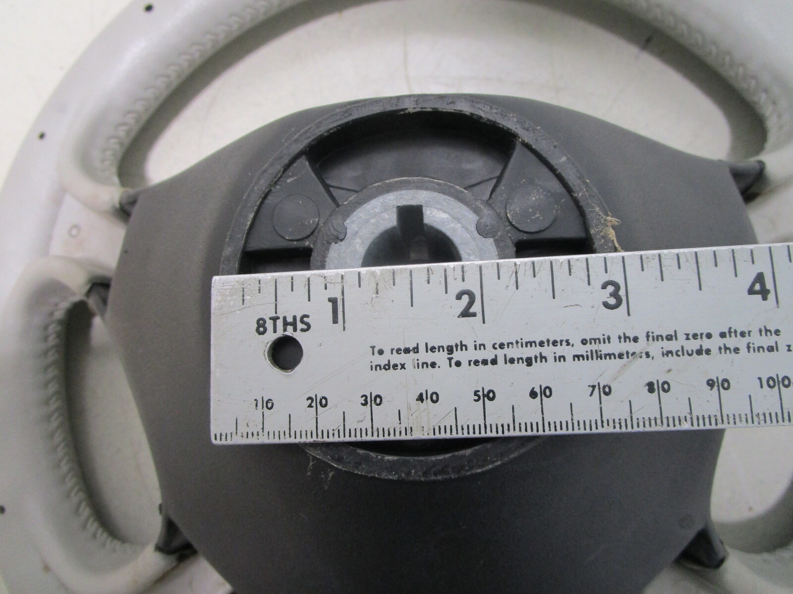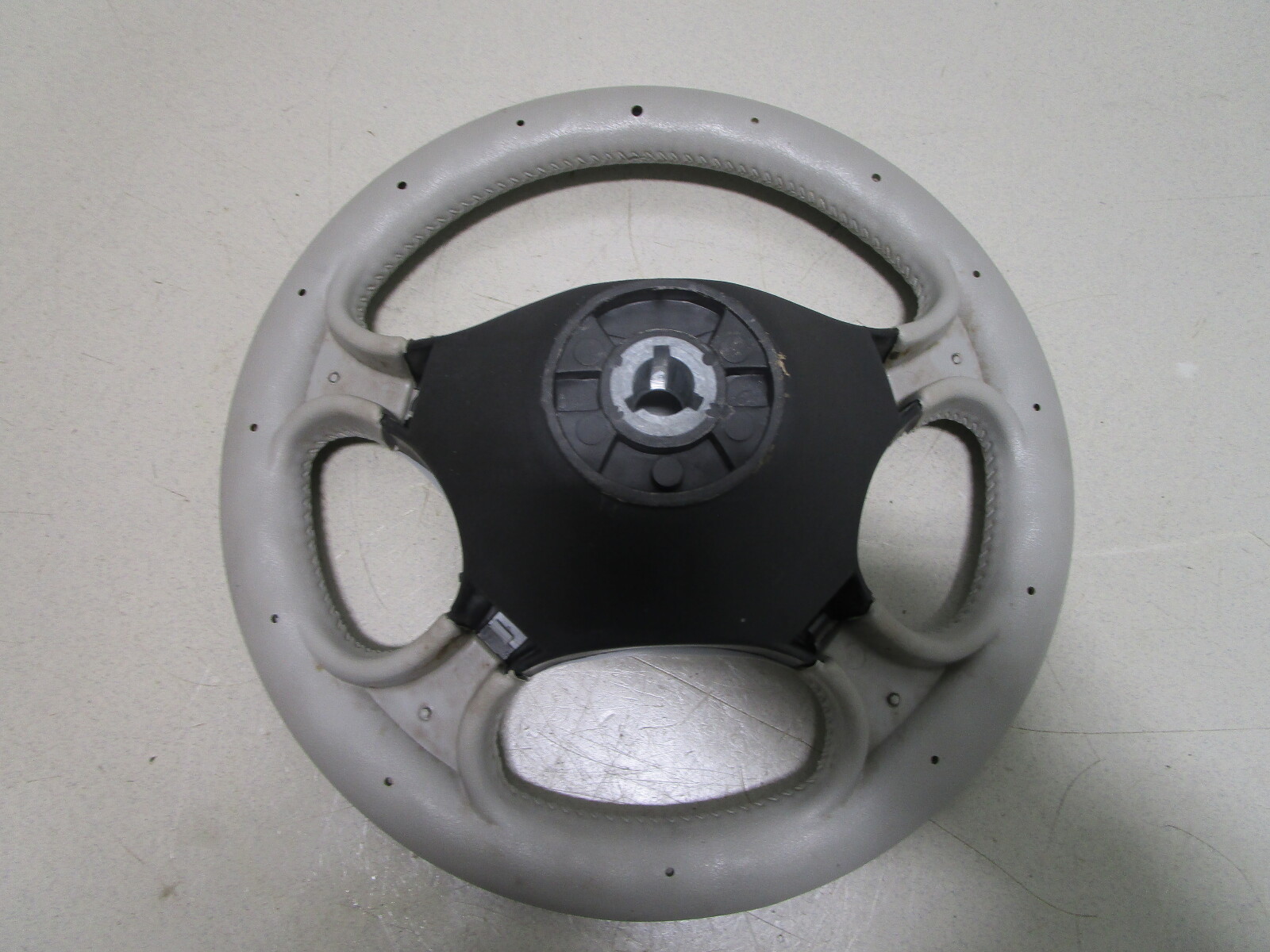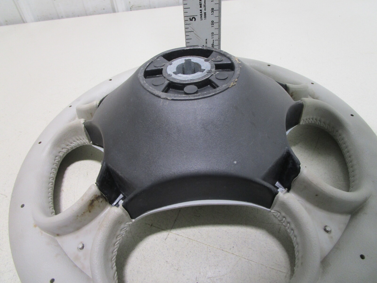 This boat steering wheel is a light grey . The Four Winns emblem is in the center of the hub.