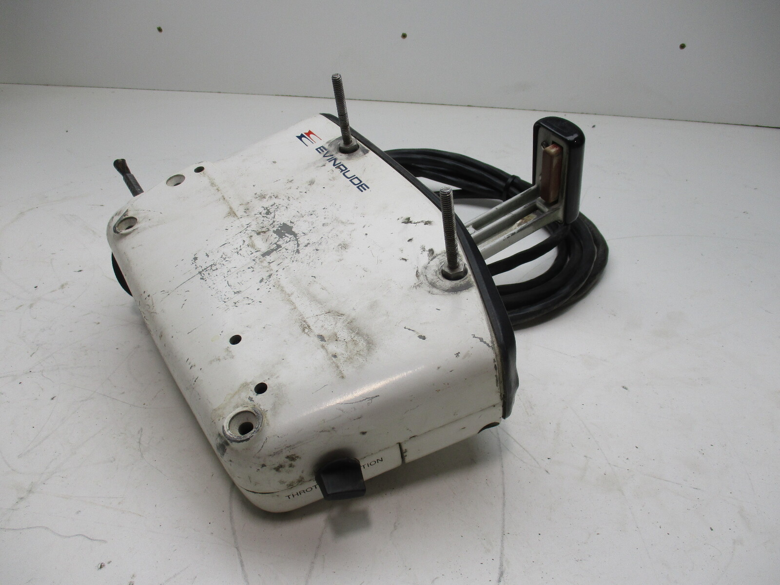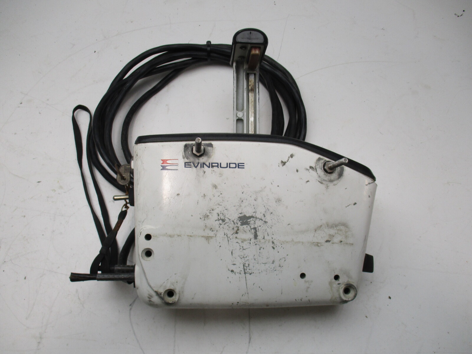 This white Evinrude remote control features an electric choke switch and a throttle only lever.
