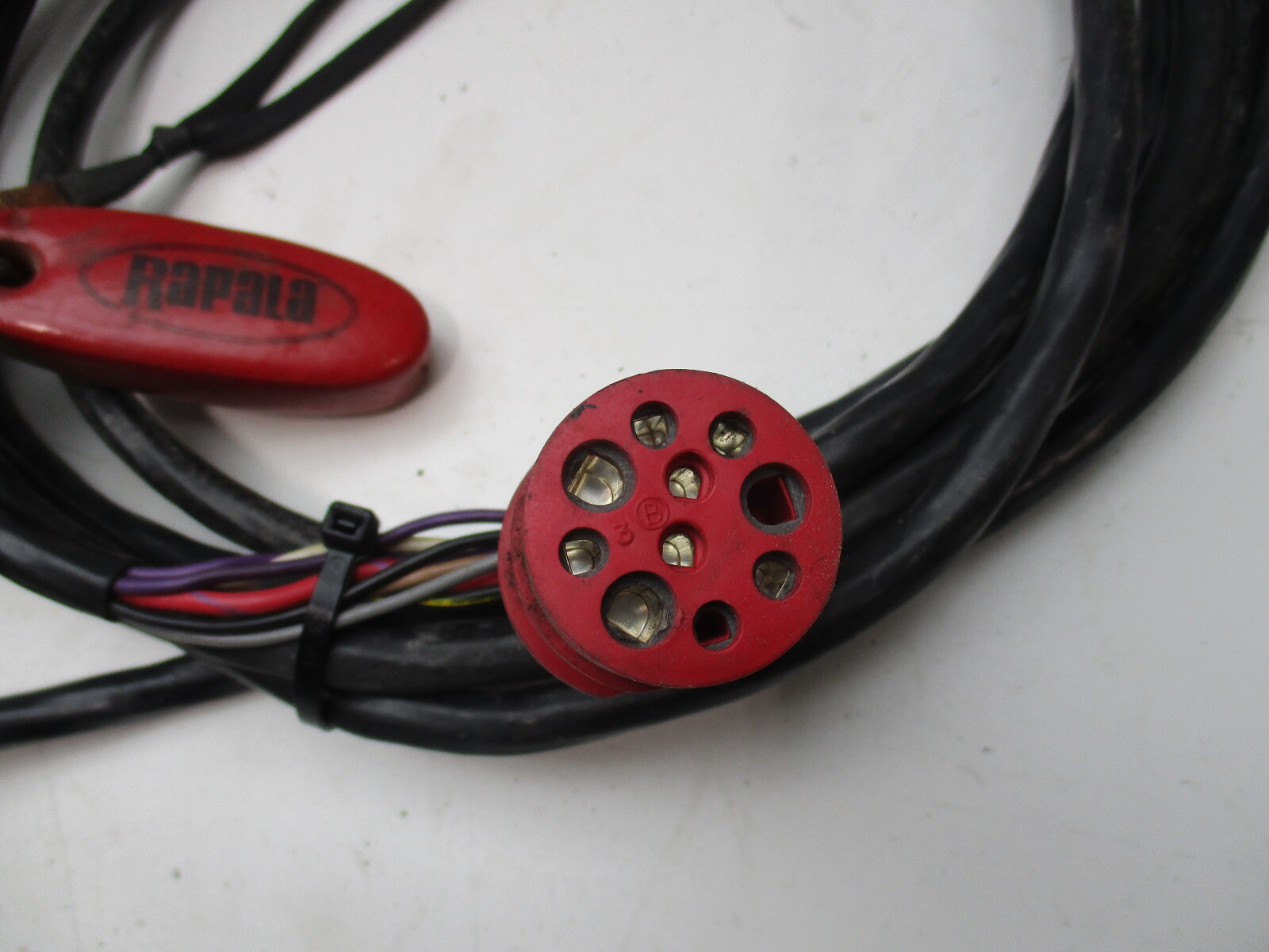 The wiring harness is 17 feet long. It has a red round 10 pin plug.