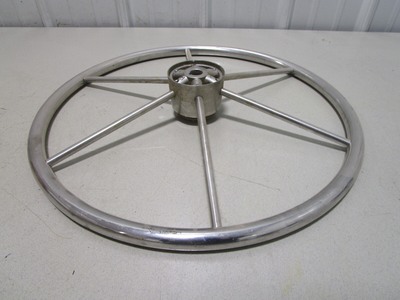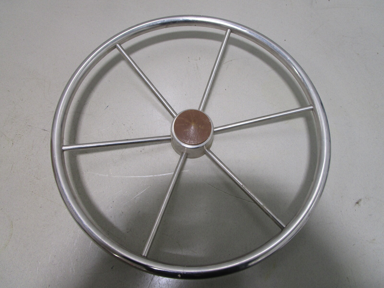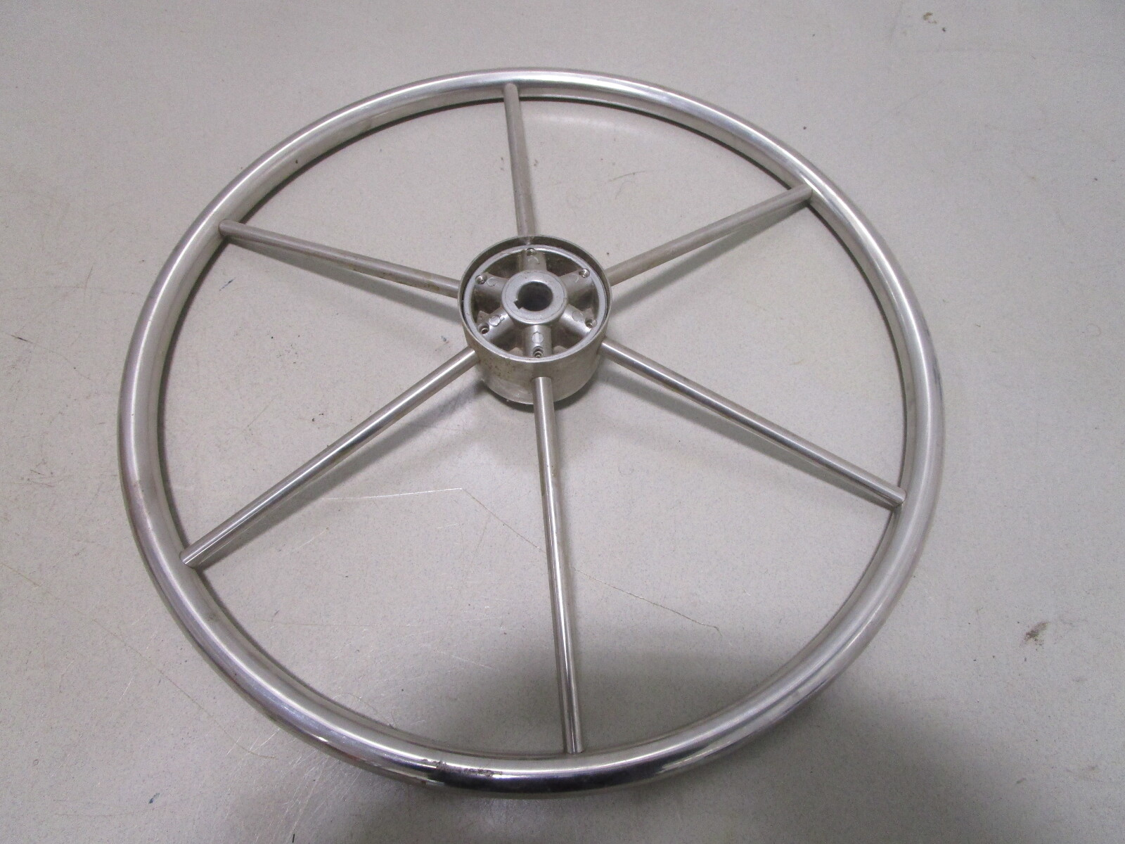 This steering wheel is made of stainless steel. It has 6 spokes and measures about 20" across.