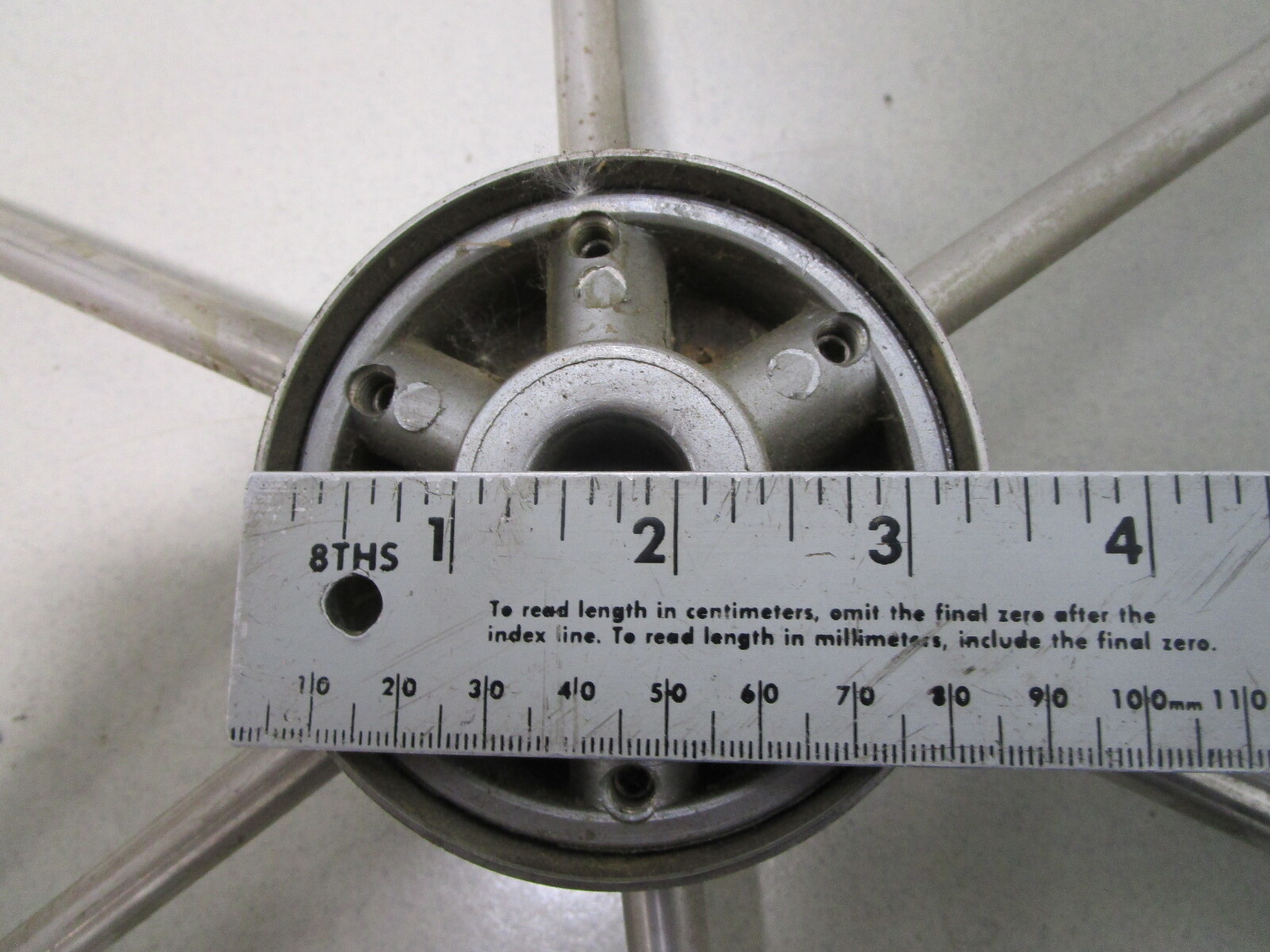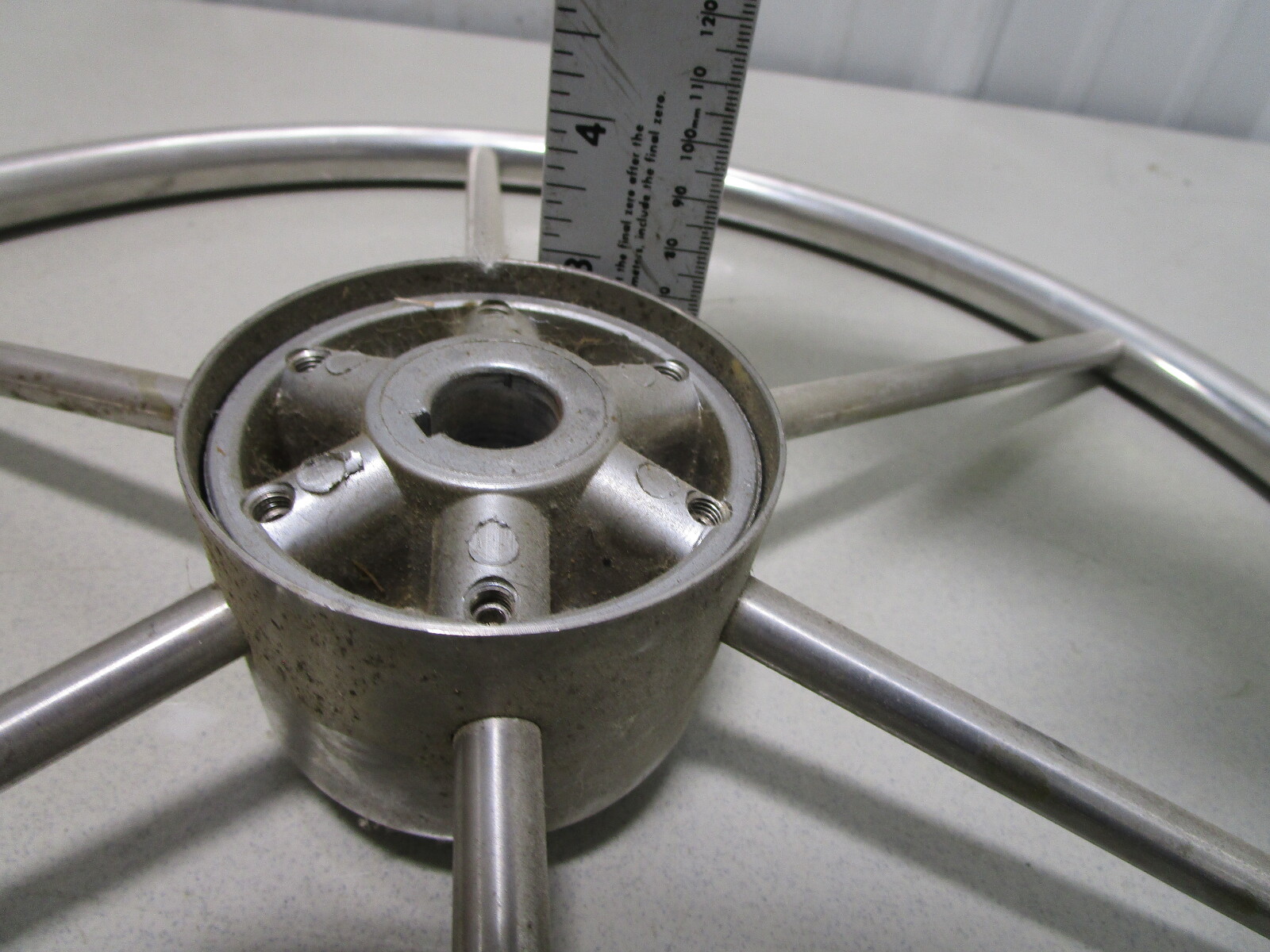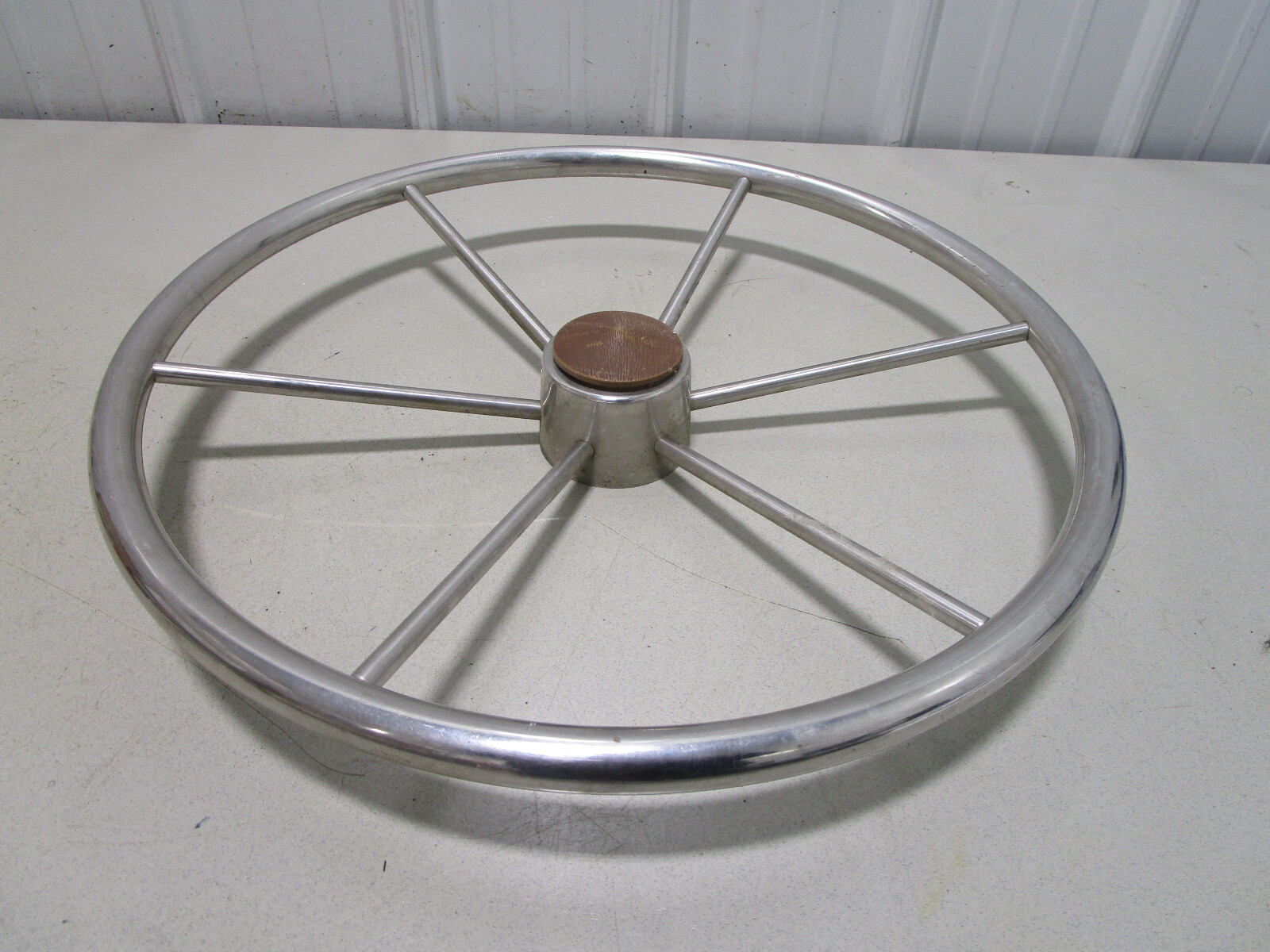 This steering wheel is made of stainless steel. It has 6 spokes and measures about 20" across.